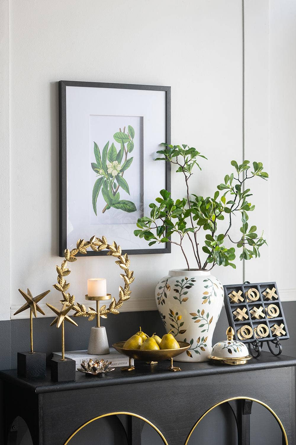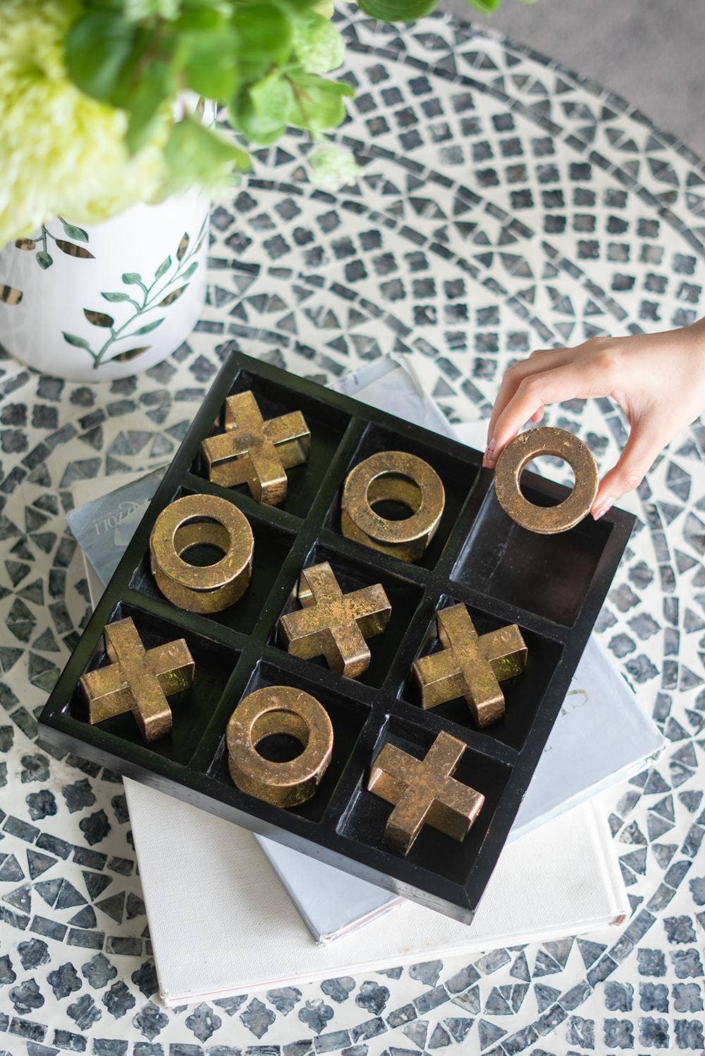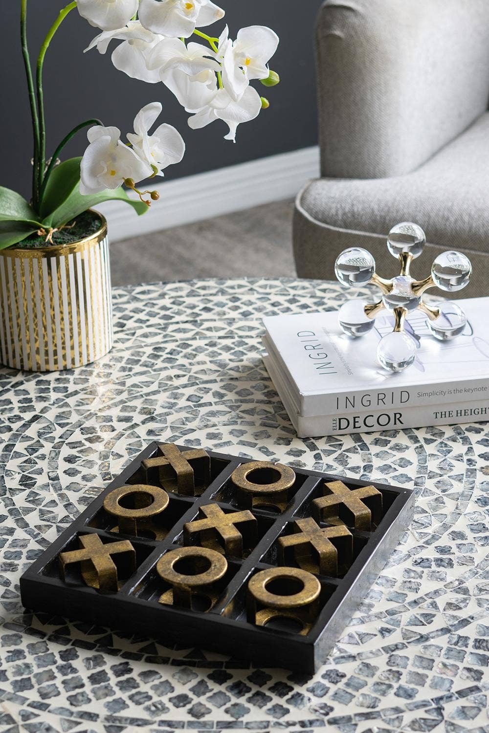 Perfect for a quick break or family night, this decorative tic-tac-toe set will infuse your living room with a burst of modern style. The box is crafted from high-quality, durable black wood that pairs beautifully with the gold-finished metal game pieces, making for a refined home accent piece.