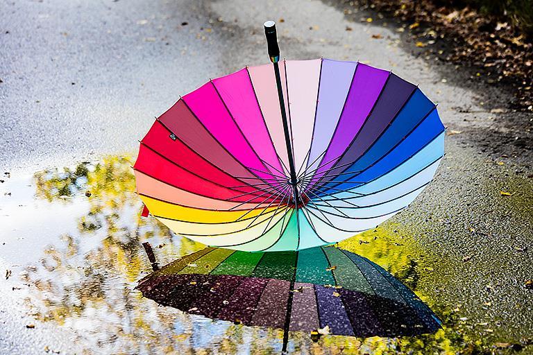 Brighten up any rainy day with this beautiful and sturdy color wheel-style umbrella! Its strong construction can hold up to heavy rain and wind.