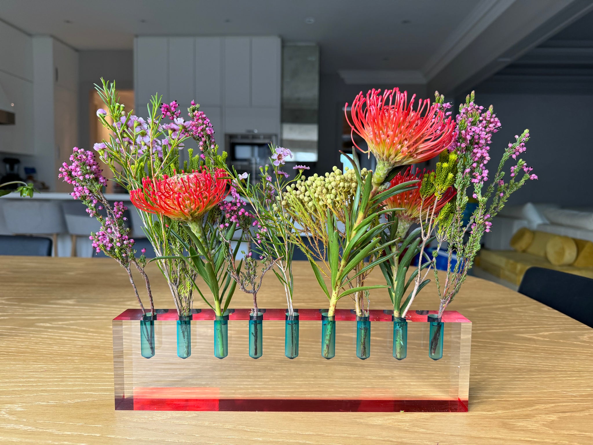 When ready for use as a flower vase, simply remove the metal cups and store them in the beautiful storage box. Fill each hole ¾ full of water and arrange with flowers of your choice. We love using it as a centerpiece for Shabbat dinner.