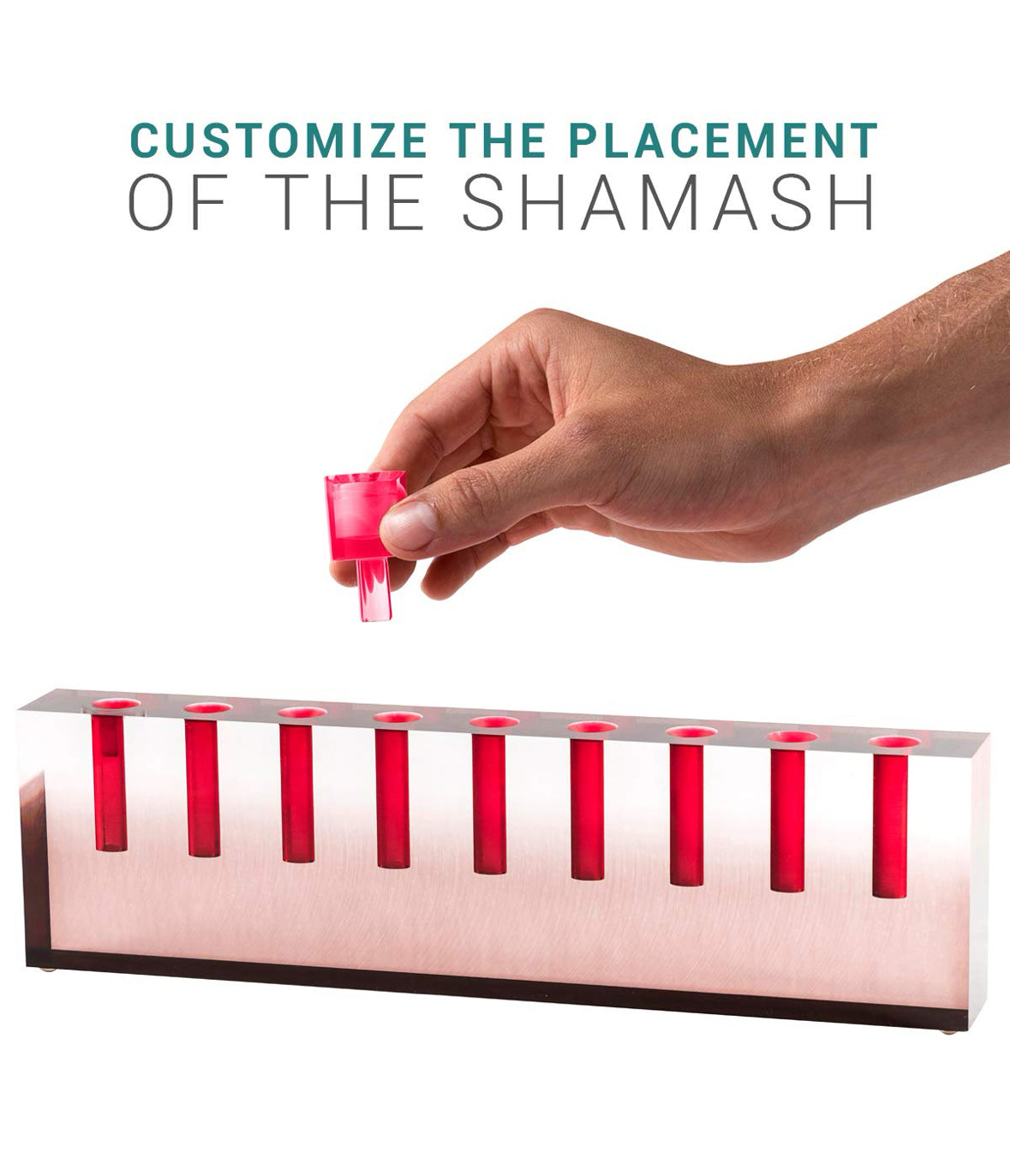 Customize the placement of the shamash! The menorah's shamash is a removable acrylic piece that can be placed in the center, on the left holder, or left off entirely.